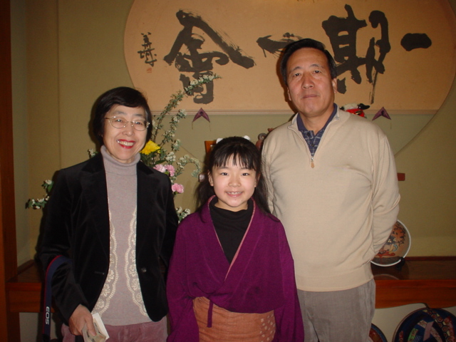 今回は、お得意様の埼玉の三田さんを紹介させていただきます。毎年、3〜4回ご来館いただいております。ありがとうございます。宿日記をご覧いただき、親父の見舞いと妹家族の帰国を知り急きょ予定を組んでいただきました。もう、かれこれ30年以上になるでしょうか!?親戚以上のお付き合いをさせていただいております。最近は、白の軽ワゴンでいらっしゃって、いっぱい自家製野菜やら珍しい植物やらを積んで持ってきてくれます。そして、空身で返してしまってすみません。なんか、うちの家族のための運搬車かな?なんて思ったり(失礼!)、今度は車動かないくらいにしてあげようと思います。私と三田さんとの今迄で一番忘れられない思い出は、月下美人をわざわざ、この日に咲く!!という日に持ってきてくれたことです。到着したその夜に咲き、涙が出るほど感激でした。たった一夜しか咲かない月下美人。私の一生の思い出です。また時間見つけて、遊びに来てください。 写真は三田さんご夫妻と理沙ちゃんです。2006/0312